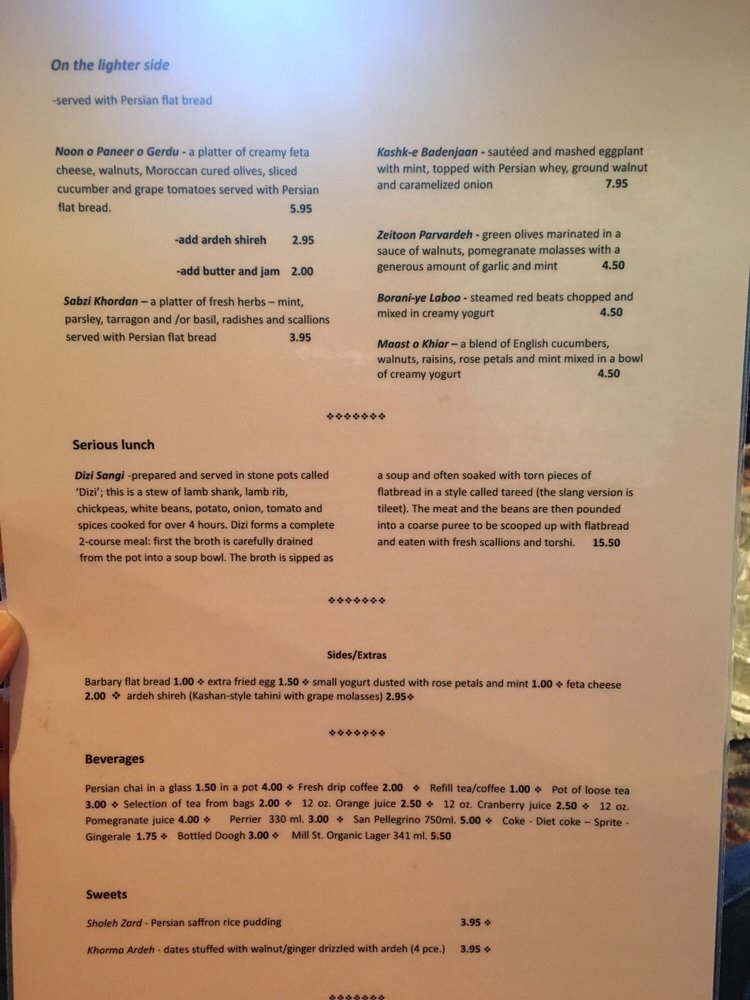 For breakfast enthusiasts, dishes such as the Safavid and Shish Andaz shine brightly, while the vegetarian options, including the Paneer Boreshteh and Vegan Delight, cater to diverse palates. A highlight is the Dizi, a comforting stew that combines rich flavors, serving as a reminder of home-cooked warmth.