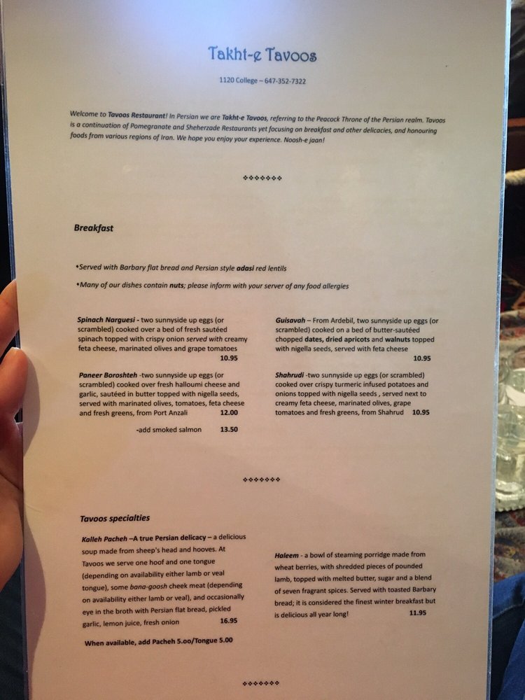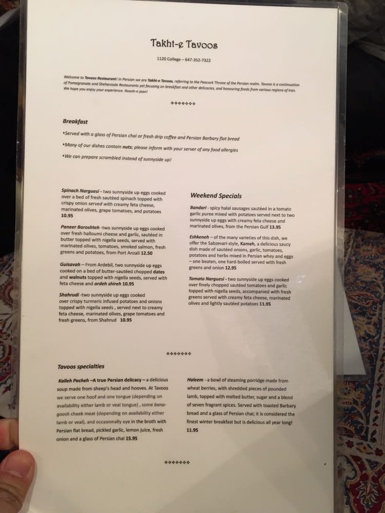 Welcome to Takht-e Tavoos Restaurant, a vibrant culinary haven located in the heart of Toronto. Offering a delightful array of authentic Persian dishes, the menu is designed to transport your taste buds straight to Iran.